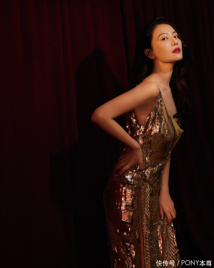 高圆圆的肩颈线条流畅,锁骨明显、手臂纤细,她身穿这款金色吊带亮片裙,尽显优雅与贵气感!
